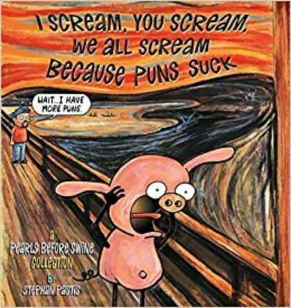 PUNS! We know it's coming. The telltale signs are all there: the oddly specific setup, the unusual word choice, and, just visible out of the corner of our eye, the final panel of Stephan sitting at his desk awaiting the chastisement of one of his characters. Somehow the pun still manages to elicit a groan larger than we expected. Fortunately for us--and for Stephan's job security--there are more than just puns in I Scream, You Scream, We All Scream Because Puns Suck. The entire Pearls Before Swine crew returns in some of the strip's most raucous cartoons yet. Rat tries his hand at public service as a judge and presidential candidate (he's accepting tips), Goat has a nasty run-in with Internet trolls (maybe it's time to get off social media), and Pig is dismayed to learn that there is no European city of "Hamsterdam" (much less a dam that holds back a river of hamsters). And like always, the Zebras can congratulate each other on a safe day and hope for a Croc-less tomorrow--in other words, the preys praise and pray.