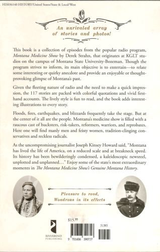 This book is a collection of episodes from the popular radio program, Montana Medicine Show by Derek Strahn, that originates at KGLT studios on the campus of Montana State University-Bozeman. Though the program strives to inform, its main objective is to entertain—to relate some interesting or quirky anecdote and provide an enjoyable or thought-provoking glimpse of Montana’s past.Given the fleeting nature of radio and the need to make a quick impression, the 117 stories are packed with colorful quotations and vivid first-hand accounts. The lively style is fun to read, and the book adds interesting illustrations to every story.Floods, fires, earthquakes, and blizzards frequently take the stage. But at the center of it all are the people. Montana’s medicine show is filled with a raucous cast of hucksters, risk-takers, reformers, warriors, and reprobates. Here one will find manly men and feisty women, tradition-clinging conservatives and reckless radicals.As the uncompromising journalist Joseph Kinsey Howard said, “Montana has lived the life of America, on a reduced scale and at breakneck speed. Its history has been bewilderingly condensed, a kaleidoscopic newsreel, unplotted and unplanned...” Enjoy some of the state’s most extraordinary moments in The Montana Medicine Show’s Genuine Montana History.