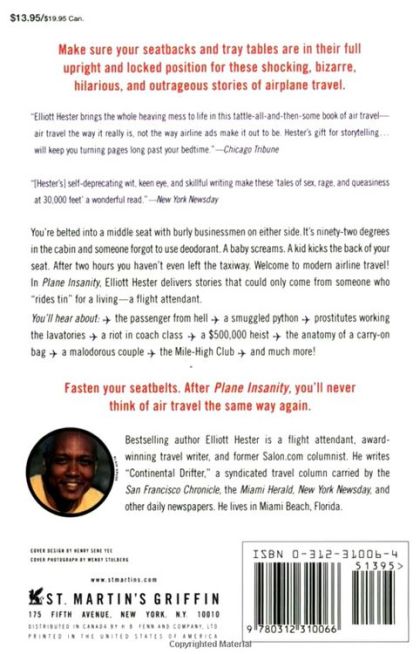 Make sure your seatbacks and tray tables are in their full upright and locked position for these shocking, bizarre, hilarious, and outrageous stories of airplane travel.You're belted into a middle seat with burly businessmen on either side. It's ninety-two degrees in the cabin and someone forgot to use deodorant. A baby screams. A kid kicks the back of your seat. After two hours you haven't even left the taxiway. Welcome to modern airline travel! In Plane Insanity, Elliott Hester delivers stories that could only come from someone who "rides tin" for a living---a flight attendant. You'll hear about:* the passenger from hell* a smuggled python* prostitutes working the lavatories* a riot in coachclass* a $500,000 heist* the anatomy of a carry-on bag* a malodorous couple* the Mile-High Club * and much more!Fasten your seatbelts. After Plane Insanity, you'll never think of air travel the same way again.