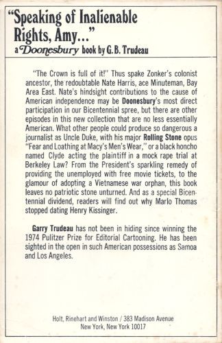 "The Crown is full of it! Thus spake Zonker's colonist ancestor, the redoubtable Nate Harris, ace Minuteman, Bay Area East. Nate's hindsight contributions to the cause of American independence may be Doonesbury's most direct participation in our Bicentennial spree, but there are other episodes in this new collection that are no less essentially American. What other people could produce so dangerous a journalist as Uncle Duke, with his major Rolling Stone opus 'Fear and Loathing at Macy's Men's Wear' or a black honcho named Clyde acting the plaintiff in a mock rape trial at Berkeley Law? From the President's sparkling remedy of providing the unemployed with free movie tickets, to the glamour of adopting a Vietnamese war orphan, this book leaves no patriotic stone unturned. And as a special Bicentennial dividend, the readers will find out why Marlo Thomas stopped dating Henry Kissinger." -- Back cover