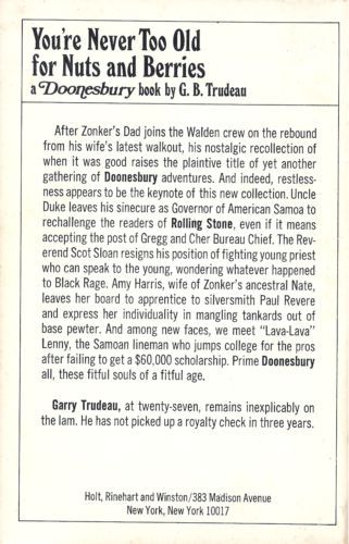 "After Zonker's Dad joins the Walden crew on the rebound from his wife's latest walkout, his nostalgic recollection of when it was good raises the plaintive title of yet another gathering of Doonesbury adventures. And indeed, restlessness appears to be the keynote of this new collection. Uncle Duke leaves his sinecure as Governor of American Samoa to rechallenge the readers of Rolling Stone, even if it means accepting the post of Gregg and Cher Bureau Chief. The Reverend Scot Sloan resigns his position of fighting young priest who can speak to the young, wondering whatever happened to Black Rage. Amy Harris, wife of Zonker's ancestral Nate, leaves her board to apprentice silversmith Paul Revere and express her individuality in mangling tankards out of base pewter. And among new faces, we meet 'Lava-Lava' Lenny, the Samoan lineman who jumps college for the pros after failing to get a $60,000 scholarship. Prime Doonesbury all, these fitful souls of a fitful age." -- Back cover