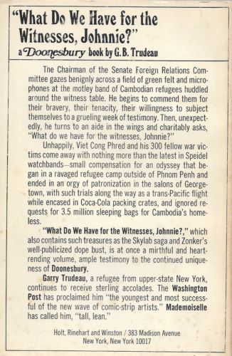 "The Chairman of the Senate Foreign Relations Committee gazes benignly across a field of green felt and microphones at the motley band of Cambodian refugees huddled around the witness table. He beings to commend them for their bravery, their tenacity, their willingness to subject themselves to a grueling week of testimony. Then unexpectedly he turns to an aide in the wings and charitably asks, 'What do we have for the witnesses, Johnnie?' Unhappily, Viet Cong Phred and his 300 fellow war victims come away with nothing more than the latest in Speidel watchbands, small compensation for an odyssey that began in a ravaged refugee camp outside Phnom Penh and ended in an orgy of patronization in the salons of Georgetown, with such trials along the way as a trans-Pacific flight while encased in Coca-Cola packing crates, and ignored requests for 3.5 million sleeping bags for Cambodia's homeless." -- Page 4 of cover