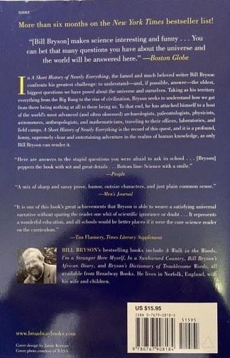 THE #1 NATIONAL BESTSELLER • One of the world’s most beloved writers and New York Times bestselling author of A Walk in the Woods and The Body takes his ultimate journey—into the most intriguing and intractable questions that science seeks to answer.“Brims with strange and amazing facts . . . destined to become a modern classic of science writing.”—The New York TimesIn A Walk in the Woods, Bill Bryson trekked the Appalachian Trail—well, most of it. In A Sunburned Country, he confronted some of the most lethal wildlife Australia has to offer. Now, in his biggest book, he confronts his greatest challenge: to understand—and, if possible, answer—the oldest, biggest questions we have posed about the universe and ourselves. Taking as territory everything from the Big Bang to the rise of civilization, Bryson seeks to understand how we got from there being nothing at all to there being us. To that end, he has attached himself to a host of the world’s most advanced (and often obsessed) archaeologists, anthropologists, and mathematicians, travelling to their offices, laboratories, and field camps. He has read (or tried to read) their books, pestered them with questions, apprenticed himself to their powerful minds. A Short History of Nearly Everything is the record of this quest, and it is a sometimes profound, sometimes funny, and always supremely clear and entertaining adventure in the realms of human knowledge, as only Bill Bryson can render it. Science has never been more involving or entertaining.