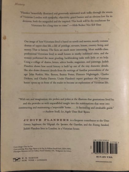 Publisher's description: The Victorian age is much closer to us in time than we might believe. Yet at that time, in the most technologically advanced nation in the world, people buried meat in fresh earth to prevent mold forming and wrung sheets out in boiling water with their bare hands. Such household drudgery was routinely performed by the grandparents of people still living, but the knowledge of it has passed as if it had never been. Judith Flanders's book is laid out like a Victorian house, taking you through the story of daily life from room to room. In each space she depicts the home's furnishings and decoration: from childbirth in the master bedroom, through the scullery and kitchen, the separate male and female domains of the drawing room and the parlor, and ending in the sickroom. A rich selection from diaries, letters, advice books, magazines, and paintings fills the rooms with the people and personalities of the age.