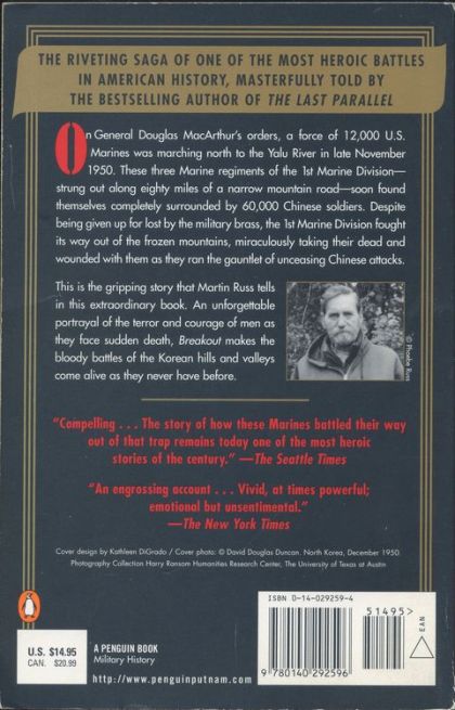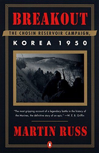 On General Douglas MacArthur's orders, a force of 12,000 U.S. Marines were marching north to the Yalu river in late November 1950. These three regiments of the 1st Marine Division--strung out along eighty miles of a narrow mountain road--soon found themselves completely surrounded by 60,000 Chinese soldiers. Despite being given up for lost by the military brass, the 1st Marine Division fought its way out of the frozen mountains, miraculously taking thier dead and wounded with them as they ran the gauntlet of unceasing Chinese attacks.This is the gripping story that Martin Russ tells in his extraordinary book. Breakout is an unforgettable portrayal of the terror and courage of men as they face sudden death, making the bloody battles of the Korean hills and valleys come alive as they never have before. Of interest will be the new PBS American Experience Documentary "The Battle of Chosin", which premiered on November 1, 2016.