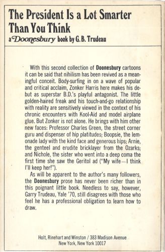 "With this second collection of Doonesbury cartoons it can be said that nihilism has been revived as a meaningful conceit. Body-surfing in on a wave of popular and critical acclaim, Zonker Harris makes his debut as superstar B.D.'s playful antagonist. The little golden haired freak and his touch and go relationship with reality are sensitively viewed in the context of his chronic encounters with Kool Aid and model airplane glue. But Zonker is not alone. He brings with him other new faces: Professor Charles Green, the street corner guru and dispenser of hip platitudes; Boopsy, the lemonade lady with the kind face and generous hips; Arnie, the genteel and erudite bricklayer from the Ozarks; and Nichole, the sister who went into a deep coma the first time she saw the Geritol ad ('My wife, I think I'll keep her!')" -- Back cover
