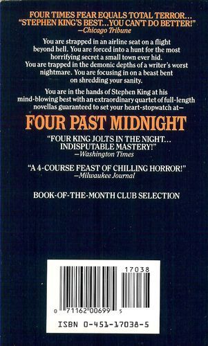 A domestic flight makes an unusual stopover in the land of "The Langoliers; " a writer confronts the reality of his success in "Secret Window, Secret Garden; " after being scolded by "The Library Policeman, " you'll never return a book late again; and once again the community of Castle Rock finds itself besieged by a nasty pooch in "The Sun Dog." A domestic flight makes an unusual stopover in the land of "The Langoliers; " a writer confronts the reality of his success in "Secret Window, Secret Garden; " after being scolded by "The Library Policeman, " you'll never return a book late again; and once again the community of Castle Rock finds itself besieged by a nasty pooch in "The Sun Dog." Four minutes past the hour, four times the terror, four tales for the price of one!