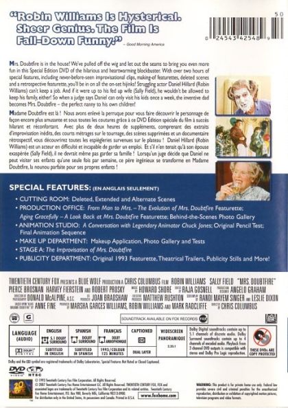 Loving but irresponsible dad Daniel Hillard, estranged from his exasperated spouse, is crushed by a court order allowing only weekly visits with his kids. When Daniel learns his ex needs a housekeeper, he gets the job -- disguised as a British nanny. Soon he becomes not only his children's best pal but the kind of parent he should have been from the start.