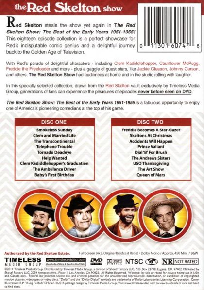 An 18 episode collection showcasing Red's comic genius during television's Golden Age. Red Skelton is at his best as Clem Kadiddlehopper and Freddie the Freeloader. Includes guest stars Johnny Carson, Jackie Gleason and a host of others on 2 DVDs. DVD 1. Smokeless Sunday, Help Wanted, Telephone Trouble, Clem & Married Life plus 5 more. DVD 2. Prince Valiant, The Andrews Sisters, USO Thanksgiving, The Art Show plus 5 more.