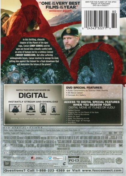 Caesar and his apes are forced into a deadly conflict with an army of humans led by a ruthless Colonel. After the apes suffer unimaginable losses, Caesar wrestles with his darker instincts and begins his own mythic quest to avenge his kind. As the journey finally brings them face to face, Caesar and the Colonel are pitted against each other in an epic battle that will determine the fate of both their species and the future of the planet.