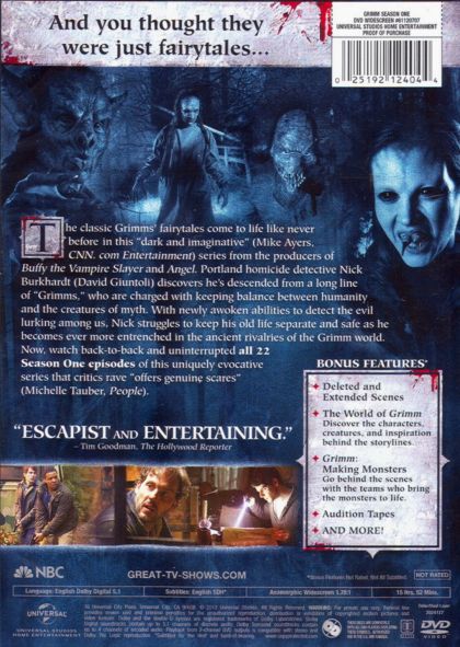 Remember the fairy tales your parents used to tell you before bedtime? Those weren't stories -- they were warnings. Nick Burkhardt thought he prepared himself for the realities of working as a homicide detective until he started seeing things he couldn't quite explain. When his ailing Aunt Marie arrives, Nick's life turns upside down when she reveals they are descendants of an elite group of hunters, also known as "Grimms," who fight to keep the balance of humanity safe from the supernatural creatures of the world. As Nick digs deeper into her past, he realizes that he will have to shoulder the responsibility of his ancestors -- and contend with a larger-than-life mythology of the Brothers Grimm that is now all too real.