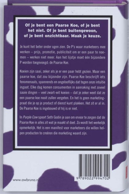 In Purple Cow spoort Seth Godin je aan om ervoor te zorgen dat de Paarse Koe in alles zit wat je maakt of doet. Zo wordt het werkelijk opmerkelijk. Het is een manifest voor marketeers die willen helpen producten te creëren die marketing waard zijn.