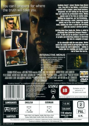 A small, seemingly innocuous plastic reel of film leads surveillance specialist Tom Welles down an increasingly dark and frightening path. With the help of the streetwise Max, he relentlessly follows a bizarre trail of evidence to determine the fate of a complete stranger. As his work turns into obsession, he drifts farther and farther away from his wife, family and simple life as a small-town PI.