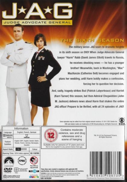 JAG (military-speak for Judge Advocate General) is an adventure drama about an elite wing of officers trained as lawyers who investigate, prosecute and defend those accused of crimes in the military. Navy Cmdr. Harmon "Harm" Rabb (David James Elliott), an ace pilot turned lawyer, and Marine Lt. Col. Sarah "Mac" MacKenzie (Catherine Bell), a beautiful by-the-book officer, are colleagues who hold the same high standards but find themselves clashing when they choose different routes to get to the same place. The unmistakable chemistry between them must be held at bay for professional reasons as they traverse the globe together with a single mission: to search for and discover the truth. Helping them with their mission is Navy Lt. Cmdr. Bud Roberts (Patrick Labyorteaux), a lawyer who proved his grit and determination when, after losing a leg in a land mine field while on a mission, fought back and became even better at his job.