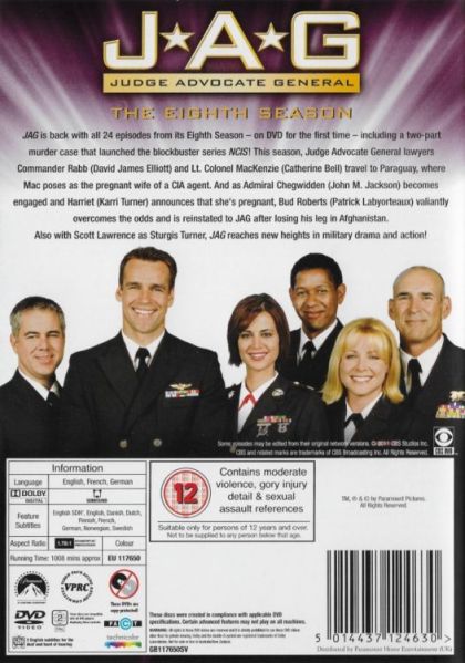 JAG (military-speak for Judge Advocate General) is an adventure drama about an elite wing of officers trained as lawyers who investigate, prosecute and defend those accused of crimes in the military. Navy Cmdr. Harmon "Harm" Rabb (David James Elliott), an ace pilot turned lawyer, and Marine Lt. Col. Sarah "Mac" MacKenzie (Catherine Bell), a beautiful by-the-book officer, are colleagues who hold the same high standards but find themselves clashing when they choose different routes to get to the same place. The unmistakable chemistry between them must be held at bay for professional reasons as they traverse the globe together with a single mission: to search for and discover the truth. Helping them with their mission is Navy Lt. Cmdr. Bud Roberts (Patrick Labyorteaux), a lawyer who proved his grit and determination when, after losing a leg in a land mine field while on a mission, fought back and became even better at his job.