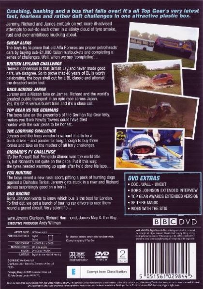 Seven fantastic challenges that test the mettle of the Top Gear team. The Top Gear boys - Jezzer, Hamster and Captain Slow - can do brake-horsepowers, torques and 0-60s until the pumps run dry. But when they take on a challenge, the action gets competitive, hilarious, dangerous and, at times, downright humiliating.