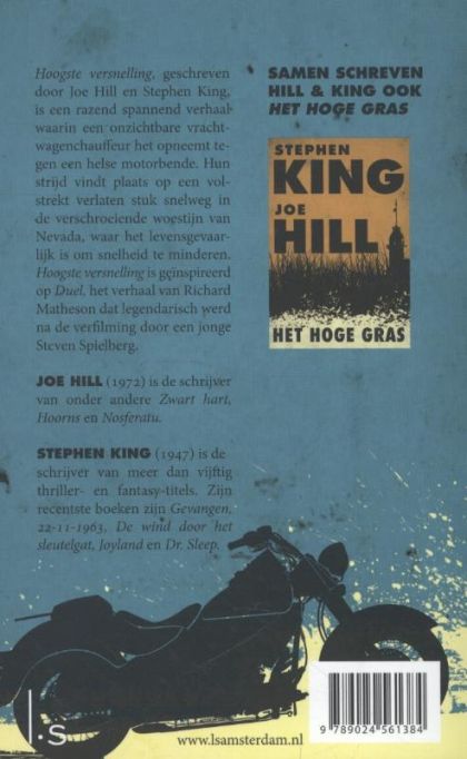 Hoogste versnelling, geschreven door Joe Hill en Stephen King, is een razend spannend verhaal waarin een onzichtbare vrachtwagenchauffeur het opneemt tegen een helse motorbende. De strijd vindt plaats op een volstrekt verlaten stuk snelweg in de verschroeiende woestijn van Nevada, waar het levensgevaarlijk is om snelheid te minderen. Hoogste versnelling is geïnspireerd op Duel, het verhaal van Richard Matheson dat legendarisch werd na de verfilming door een jonge Steven Spielberg.
