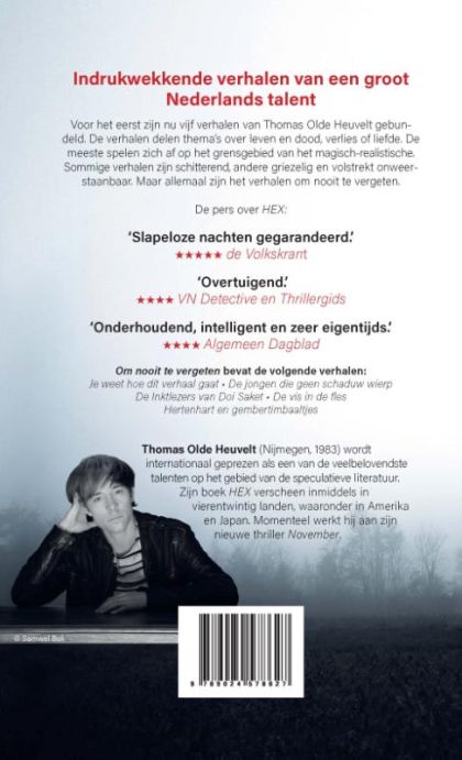To never forget 'is a collection of short stories by Dutch talent Thomas Olde Heuvelt, who earlier broke through internationally with' HEX '. For the first time, five of his stories have now been bundled together. Two of them have never been published before. The stories share themes about life and death, loss or love. Most of them take place on the borderline of the magic-realistic. Some stories are beautiful, others are creepy and totally irresistible. But all of them are stories never to be forgotten.