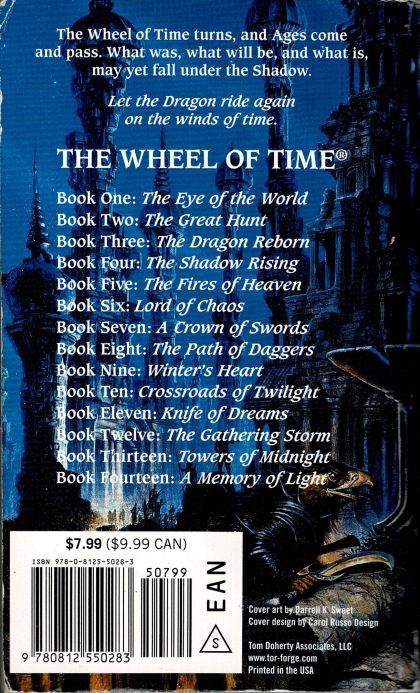 The Wheel of Time is now an original series on Prime Video, starring Rosamund Pike as Moiraine! Since its debut in 1990, The Wheel of Time® by Robert Jordan has captivated millions of readers around the globe with its scope, originality, and compelling characters.The Wheel of Time turns and Ages come and go, leaving memories that become legend. Legend fades to myth, and even myth is long forgotten when the Age that gave it birth returns again. In the Third Age, an Age of Prophecy, the World and Time themselves hang in the balance. What was, what will be, and what is, may yet fall under the Shadow.Elayne, Aviendha, and Mat come ever closer to the bowl ter'angreal that may reverse the world's endless heat wave and restore natural weather. Egwene begins to gather all manner of women who can channel--Sea Folk, Windfinders, Wise Ones, and some surprising others. And above all, Rand faces the dread Forsaken Sammael, in the shadows of Shadar Logoth, where the blood-hungry mist, Mashadar, waits for prey.The Wheel of Time®New Spring: The Novel#1 The Eye of the World#2 The Great Hunt#3 The Dragon Reborn#4 The Shadow Rising#5 The Fires of Heaven#6 Lord of Chaos#7 A Crown of Swords#8 The Path of Daggers#9 Winter's Heart#10 Crossroads of Twilight#11 Knife of DreamsBy Robert Jordan and Brandon Sanderson#12 The Gathering Storm#13 Towers of Midnight#14 A Memory of LightBy Robert Jordan and Teresa PattersonThe World of Robert Jordan's The Wheel of TimeBy Robert Jordan, Harriet McDougal, Alan Romanczuk, and Maria SimonsThe Wheel of Time CompanionBy Robert Jordan and Amy RomanczukPatterns of the Wheel: Coloring Art Based on Robert Jordan's The Wheel of Time