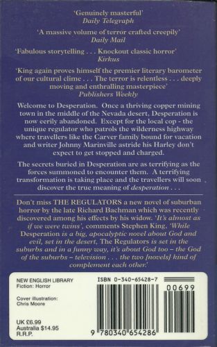 Welcome to Desperation. Once a thriving copper mining town in the middle of the Nevada desert, Desperation is now eerily abandoned. It's the last place that travellers like the Carver family, bound for vacation, and writer Johnny Marinville, astride his Harley, would expect to be stopped and charged. But Desperation still has a local cop - a unique regulator who patrols the wilderness highway. The secrets buried in Desperation are as terrifying as the forces summoned to encounter them. A terrifying transformation is taking place and the travellers will soon discover the true meaning of desperation . . .