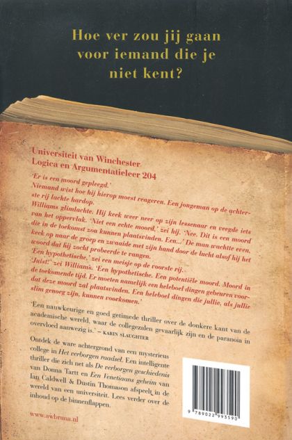 Williams glimlachte. Hij keek weer neer op zijn lessenaar en veegde iets van het oppervlak. ?Niet een echte moord,? zei hij. ?Nee. Dit is een moord die in de toekomst zou kunnen plaatsvinden. Een?? De man wachtte even, keek op naar de groep en zwaaide met zijn hand door de lucht alsof hij het woord dat hij zocht probeerde te vangen.