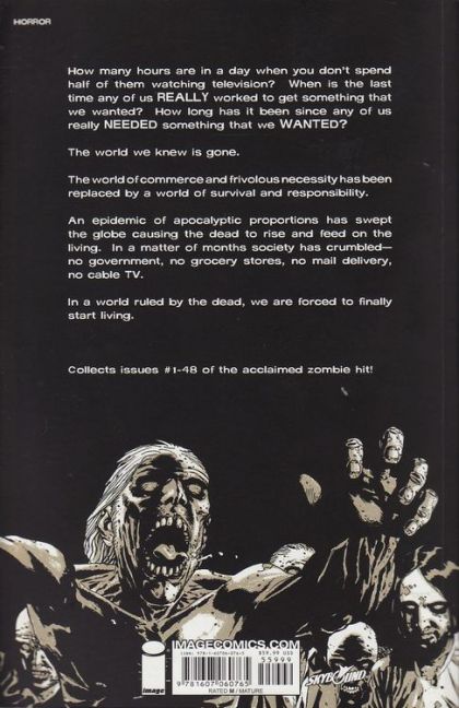 Introducing the first eight volumes of the fan-favorite, New York Times Best Seller series collected into one massive paperback collection! Collects The Walking Dead #1-48. This is the perfect collection for any fan of the Emmy Award-winning television series on AMC: over one thousand pages chronicling the beginning of Robert Kirkman's Eisner Award-winning continuing story of survival horror- from Rick Grimes' waking up alone in a hospital, to him and his family seeking solace on Hershel's farm, and the controversial introduction of Woodbury despot: The Governor. In a world ruled by the dead, we are finally forced to finally start living.