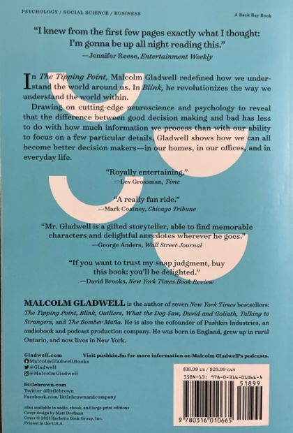 In his landmark bestseller The Tipping Point, Malcolm Gladwell redefined how we understand the world around us. Now, in Blink, he revolutionizes the way we understand the world within.Blink is a book about how we think without thinking, about choices that seem to be made in an instant-in the blink of an eye-that actually aren't as simple as they seem. Why are some people brilliant decision makers, while others are consistently inept? Why do some people follow their instincts and win, while others end up stumbling into error? How do our brains really work-in the office, in the classroom, in the kitchen, and in the bedroom? And why are the best decisions often those that are impossible to explain to others?In Blink we meet the psychologist who has learned to predict whether a marriage will last, based on a few minutes of observing a couple; the tennis coach who knows when a player will double-fault before the racket even makes contact with the ball; the antiquities experts who recognize a fake at a glance. Here, too, are great failures of "blink": the election of Warren Harding; "New Coke"; and the shooting of Amadou Diallo by police.Blink reveals that great decision makers aren't those who process the most information or spend the most time deliberating, but those who have perfected the art of "thin-slicing"-filtering the very few factors that matter from an overwhelming number of variables.