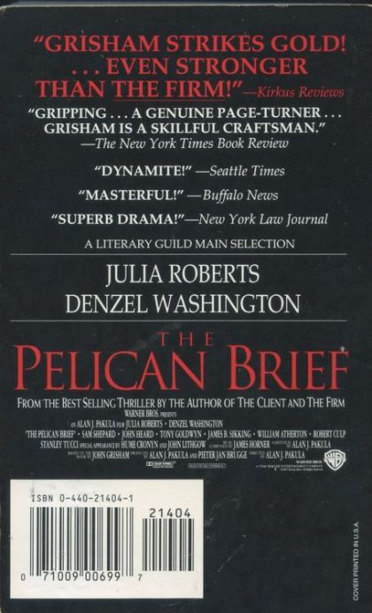 In suburban Georgetown a killer's Reeboks whisper on the front floor of a posh home... In a seedy D.C. porno house a patron is swiftly garroted to death... The next day America learns that two of its Supreme Court justices have been assassinated. And in New Orleans, a young law student prepares a legal brief... To Darby Shaw it was no more than a legal shot in the dark, a brilliant guess. To the Washington establishment it was political dynamite. Suddenly Darby is witness to a murder -- a murder intended for her. Going underground, she finds there is only one person she can trust -- an ambitious reporter after a newsbreak hotter than Watergate -- to help her piece together the deadly puzzle. Somewhere between the bayous of Louisiana and the White House's inner sanctums, a violent cover-up is being engineered. For somone has read Darby's brief. Someone who will stop at nothing to destroy the evidence of an unthinkable crime."Gripping... a genuine page-turner. Grisham is a skillful craftsman." -- "The New York Times Book Review." "Grisham has done it again!" -- "Chicago Tribune." "A fast-paced thriller... it's got the unmistakable Grisham style -- conspiracy in high places, evil and innocent lawyers, assassins and a plot that will keep you reading into the small hours of the morning." -- "The Cincinnati Post."