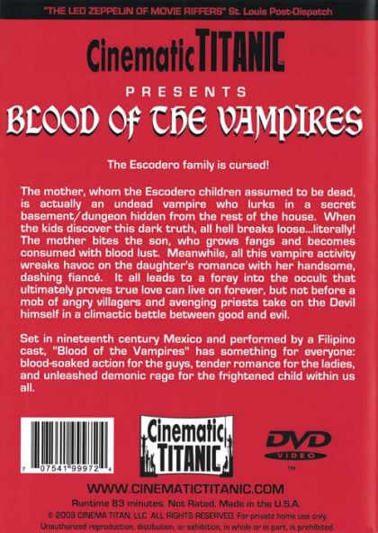 The Escodero family is cursed!The mother, whom the Escodero children assumed to be dead, is actually an undead vampire who lurks in a secret basement/dungeon hidden from the rest of the house. When the kids discover this dark truth, all hell breaks loose...literally! The mother bites the son, who grows fangs and becomes consumed with blood lust. Meanwhile, all this vampire activity wreaks havoc on the daughter's romance with her handsome, dashing fiance. It all leads to a foray into the occult that ultimately proves true love can live on forever, but not before a mob of angry villagers and avenging priests take on the Devil himself in a climactic battle between good and evil. Set in nineteenth century Mexico and performed by a Filipino cast, "Blood of the Vampires" has something for everyone: blood-soaked action for the guys, tender romance for the ladies, and unleashed demonic rage for the frightened child within us all.