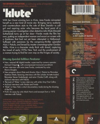 With her Oscar-winning turn in Klute, Jane Fonda reinvented herself as a new kind of movie star. Bringing nervy audacity and counterculture style to the role of Bree Daniels-a call girl and aspiring actor who becomes the focal point of a missing-person investigation when detective John Klute (Donald Sutherland) turns up at her door-Fonda made the film her own, putting an independent woman and escort on-screen with a frankness that had not yet been attempted in Hollywood. Suffused with paranoia by the conspiracy-thriller specialist Alan J. Pakula, and lensed by master cinematographer Gordon Willis, Klute is a character study thick with dread, capturing the mood of early-1970s New York and the predicament of a woman trying to find her own way on the fringes of society.