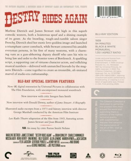 Marlene Dietrich and James Stewart ride high in this superb comedic western, both a boisterous spoof and a shining example of its genre. As the brawling, rough-and-tumble saloon singer Frenchy, Dietrich shed her exotic love-goddess image and launched a triumphant career comeback, while Stewart cemented his amiable everyman persona, in his first of many westerns, with a charming turn as a gun-abhorring deputy sheriff who uses his wits to bring law and order to the frontier town of Bottleneck. A sparkling script, a supporting cast of virtuoso character actors, and rollicking musical numbers-delivered with unmatched bravado by the magnetic Dietrich-come together to create an irresistible, oft-imitated marvel of studio-era craftsmanship.