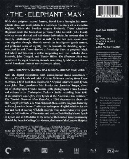 Archival interviews with Lynch, actor John Hurt, producers Mel Brooks and Jonathan Sanger, director of photography Freddie Francis, stills photographer Frank Connor, and makeup artist Christopher Tucker