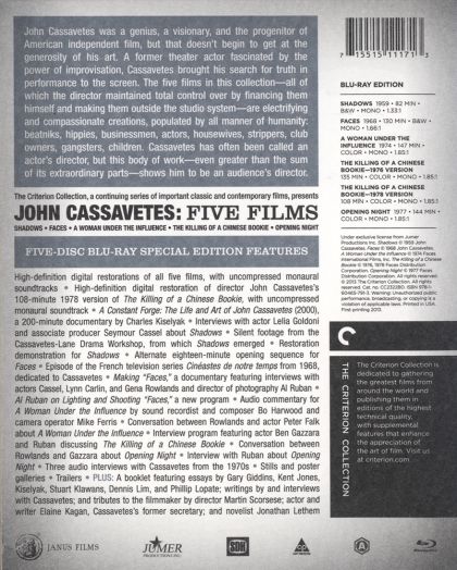 PLUS: A booklet featuring an essay by critic Gary Giddins and a 1961 article by Cassavetes (DVD release)