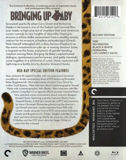 Screwball sparks fly when Cary Grant and Katharine Hepburn let loose in one of the fastest and funniest films ever made-a high-wire act of invention that took American screen comedy to new heights of absurdity. Hoping to procure a million-dollar endowment from a wealthy society matron for his museum, a hapless paleontologist (Grant) finds himself entangled with a dizzy heiress (Hepburn) as the manic misadventures pile up-a missing dinosaur bone, a leopard on the loose, and plenty of gender-bending mayhem among them. Bringing Up Baby’s sophisticated dialogue, spontaneous performances, and giddy innuendo come together in a whirlwind of comic chaos captured with lightning-in-a-bottle brio by director Howard Hawks.