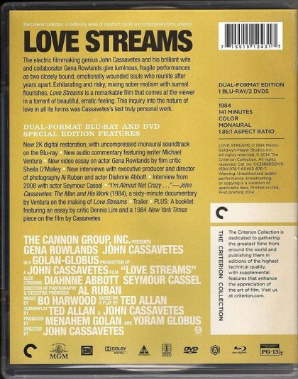 The electric filmmaking genius John Cassavetes and his brilliant wife and collaborator Gena Rowlands give luminous, fragile performances as two closely bound, emotionally wounded souls who reunite after years apart. Exhilarating and risky, mixing sober realism with surreal flourishes, Love Streams is a remarkable film that comes at the viewer in a torrent of beautiful, erratic feeling. This inquiry into the nature of love in all its forms was Cassavetes’s last truly personal work.
