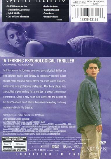 Handsome 25-year-old Cesar had it all -- a successful career, expensive cars, a swank bachelor's pad, and an endless string of beautiful and willing women -- until he is thrown into a strange psychological mystery after a car accident scars his face and lands him in prison.