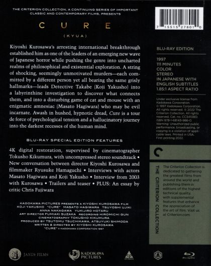 Kiyoshi Kurosawa’s arresting international breakthrough established him as one of the leaders of an emerging new wave of Japanese horror while pushing the genre into uncharted realms of philosophical and existential exploration. A string of shocking, seemingly unmotivated murders—each committed by a different person yet all bearing the same grisly hallmarks—leads Detective Takabe (Koji Yakusho) into a labyrinthine investigation to discover what connects them, and into a disturbing game of cat and mouse with an enigmatic amnesiac (Masato Hagiwara) who may be evil incarnate. Awash in hushed, hypnotic dread, Cure is a tour de force of psychological tension and a hallucinatory journey into the darkest recesses of the human mind.
