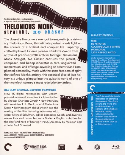 The closest a film camera ever got to enigmatic jazz visionary Thelonious Monk, this intimate portrait sheds light on the corners of a brilliant and complex life. Superbly crafted by Direct Cinema pioneer Charlotte Zwerin from a trove of precious 1960s archival footage, Thelonious Monk Straight, No Chaser captures the pianist, composer, and bebop innovator in rare, unguarded moments on- and offstage, revealing an eccentric and complicated personality. Made with the same freedom of spirit that defines Monk’s artistry, this essential slice of jazz history is a unique glimpse into the quixotic world of one of the twentieth century’s most revolutionary artists.