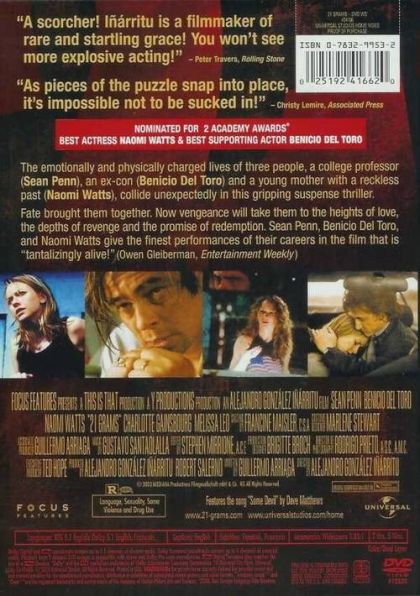 "21 Grams" is the story of three very different but equally troubled people whose lives unexpectedly cross paths. Paul (Penn) is a married man in desperate need of a heart transplant. Cristina (Watts) lives with her husband Michael (Huston) and their two daughters, while Jack (Del Toro) is a born-again Christian who has served time in prison. When Paul is suddenly given a new heart, he goes to great measures to find out how he acquired his second chance at life, but what he discovers is more tragic than he could ever have imagined. (Tricia Littrell)