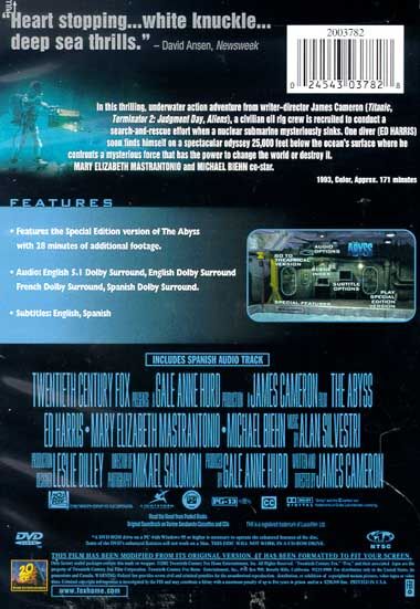 The Dolby® Digital 5.1-channel discrete soundtrack, though a bit dated in fidelity, still stands as an exemplary sound mix that stands the test of time. The utilization of dimension, surround sound envelopment, and deep bass are remarkable, along with the enhancements incorporated for the re-purposed 5.1-channel soundtrack. The effectiveness of the directional and ambient sound effects is noteworthy, and stands on its own even with many of today’s digital soundtrack productions. The dialogue production has the typical ADR characteristics but otherwise is presented at a pleasing listening level. The surrounds are craftily utilized, often aggressively, creating a convincing sensation of being underwater or inside the submerged environments. The only limitation with the surrounds is that they are sourced from a 4-track master, and therefore are generally mono. Deep bass utilization is remarkable, with a rumbling presence that is sometimes intense and penetrating with some .1 LFE enhancement. The well-known Alan Silvestri music score sounds a bit dated but nonetheless is expansive and engaging. The Abyss delivers an excellent soundtrack experience that easily holds it own with many of today’s 5.1-channel soundtracks. It is definitely sure to please and an essential cornerstone of your home theatre software library.
