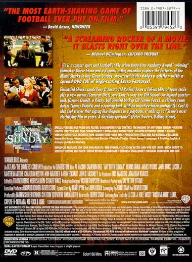 With the best real on-field football action since Varsity Blues, Any Given Sunday stars Al Pacino as Tony D’Amato, long-time coach for the Miami Sharks facing personal problems, recent losing seasons, injuries, primadonna athletes, a team doctor (Woods) with questionable ethics and a profit-minded owner (Diaz) who inherited the team from her daddy. You know, typical professional sports team troubles. Note to filmmakers: real sports writers do not look or dress like the ones you all insist on casting in your movies. Please work on this. The disc is listed as a ”Special Edition Director’s Cut” and interestingly, runs three- to five-minutes (depending on the source) shorter than the theatrical release. The Warner press release for the DVD states the disc is six minutes longer than the theatrical version. (Laurie Sevano)