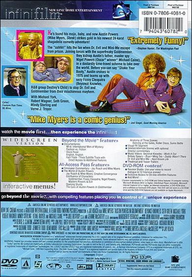 The multichannel discrete soundtrack presentations offer consistently liberal, aggressive spatial engagement with plenty to offer in terms of the stereo surrounds and back surround. Overall volume level seems a little high. The music provides for almost complete envelopment of the listening space, including the substantial use of the back surround channel, which can equal the activity of the left and right surrounds. Fidelity is top-notch, and tonality in general is nicely balanced. Voices are abundantly clear and distinct, and quite well placed with the visuals. The music score is a wonderful recording, with a deep, satisfying low-end presence. Deep bass in general is certainly aggressive in nature, with an occasionally tendency to be intense, with full extension below 25 Hz, including the surrounds, as well as substantial .1 LFE activity. The DTS-ES version seems to be distinguished from the Dolby Digital version, in terms of low-end articulation and spatial resolution, through actually somewhat less than expected for the latter. This soundtrack is clearly a standout from the first two Austin Powers installments for its significant engagement of dimension, dynamic range, and deep bass. (Perry Sun)