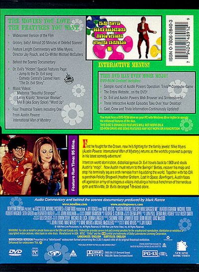Once again, Austin Powers brings exceptional color fidelity to home theatre. Hues are eye-popping and vibrant, with rich and warm colors, accurate fleshtones and deep, deep blacks. Images are sharp and detailed, with fine detail and definition. The anamorphically enhanced DVD viewed in component video exhibits exceptional clarity and an almost three-dimensional image with detail into deep backgrounds. Contrast and shadow delineation are superb, with exceptional gradation between the darkest scenes and the deepest blacks. The picture really pops with brilliance. [I was mesmerized by the unbelievably likeness the DVD picture exhibited compared to the high-definition lay down that I viewed during the Philips Spirit Datacine film-to-video transfer at Laser Pacific. While the HD 1080i master had the slightest resolution edge, the richness of the color as well as contrast are faithfully rendered on this DVD release. When viewed through a progressive scan DVD player at greater than 480p, for example 768p, the picture quality is awesome-certainly one of the very best DVD releases ever.-Editor Gary] There is no compression pixelization or artifacts for a picture that is by far one of the best reviewed DVDs at our facility. The DVD measures 2.35:1, anamorphic and letterbox.