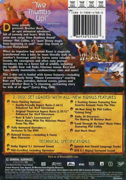 "Brother Bear" is the story of a boy who becomes a man by becoming a bear. Kenai (Phoenix) is a young man set on revenge against a bear he feels is responsible for his brother’s death. Going up against the beast and winning the battle, the great Spirits who guide Kenai transform him into a bear himself. As he lives life in the wild and communicates with the other animals, Kenai is taught a valuable lesson about the hunted and those who do the hunting. Fans of Strange Brew will delight in the voices of Dave Thomas and Rick Moranis as two wisecracking Moose, eh. (Tricia Littrell)