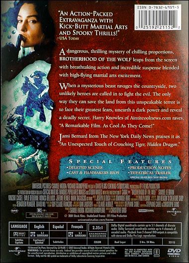 In “Brotherhood Of The Wolf” (“Le Pacte Des Loups”), a huge beast is said to be responsible for the deaths that are occurring in 18th century France. The King calls upon Chevalier Gregoire de Fronsac (Le Bihan) and Canadian Indian Mani (Dacascos) to kill the wild animal. As they make their journey in search of the killer, Gregoire and Mani learn to face their own fears as they hunt the evil that roams the land and destroys those it comes in contact with. (Tricia Littrell)