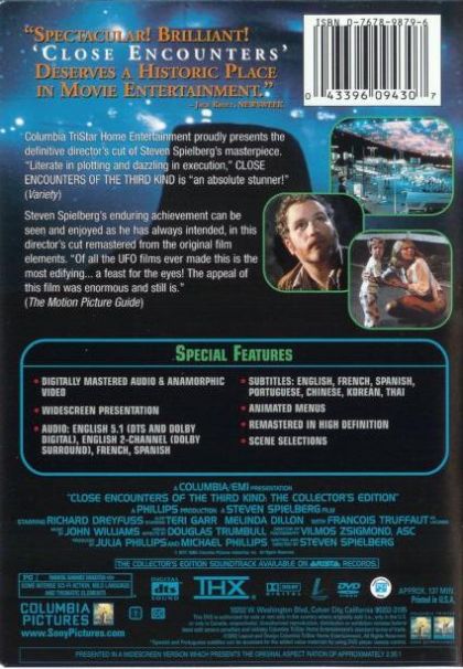 Winner of Academy Awards® for Cinematography and Sound Effects Editing, Close Encounters Of The Third Kind sparked more interest than ever before in the possibility we are not alone...and out government knows it. Richard Dreyfuss and others inexplicably drawn to a very specific location where they discover an entire UFO landing compound ready to welcome...what? The version here is the same 137-minute cut also seen on the most-recent LaserDisc. (Laurie Sevano)