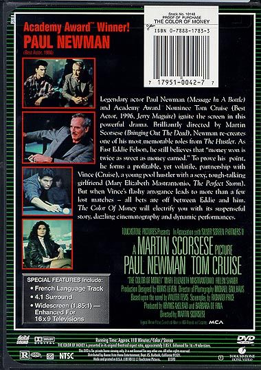 Based upon the novel by Walter Tevis and Robert Rossen’s film “The Hustler,” Martin Scorsese’s “The Color Of Money” is substantial enough of a film to stand on its own. Banned from playing pool professionally in The Hustler, Fast Eddie Felson (Newman who finally won an Oscar® for this role) has become a frontman for younger hustlers. His latest find is arrogant Vincent (Cruise), a kid who is just like Eddie was when he was young. Knowing what happened to Eddie makes one realize that Vince should change his ways before all bets are off. (Suzanne Hodges)