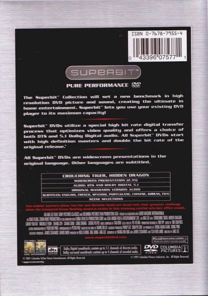 The Dolby® Digital 5.1-channel soundtrack is a new encoding at 448 kbps. (The Mandarin language version for the previous DVD was 384 kbps.) The audio is otherwise essentially identical to the previous. The DTS® Digital Surround™ version is somewhat lower in LFE level than its Dolby Digital counterpart, and as a result delivers with just slightly less low-end punch. Otherwise, both versions deliver remarkable performance in terms of spatial attributes. (Perry Sun)