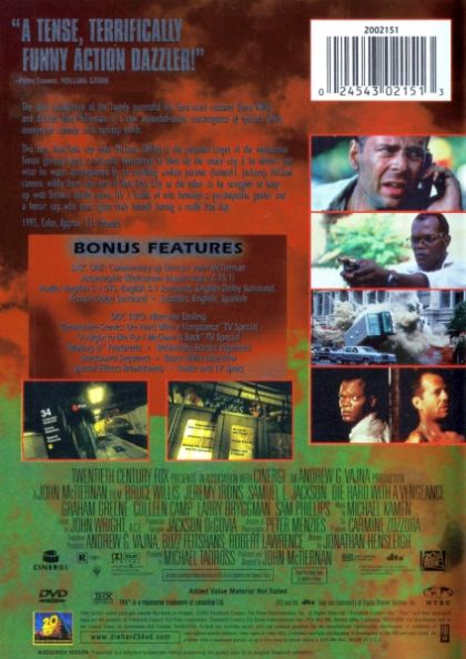 The Dolby Digital 5.1-channel soundtrack for this DVD isn’t notably different than for the previous. The DTS Digital Surround version, like the first two Die Hard DVDs, is preferred for having a subtly yet noticeably deeper low-end presence, as well as spatial delineation that resoluts in a more coherent dimensional soundstage with refined atmosphere and imaging. Like the first two in the Die Hard series, the soundtracks are both outstanding with remarkable utilization of frequency and dynamic range. Fidelity is of course the most refined for this installment in the Die Hard trilogy, as is the creativity in terms of spaciousness and dimensional utilization. (Perry Sun)