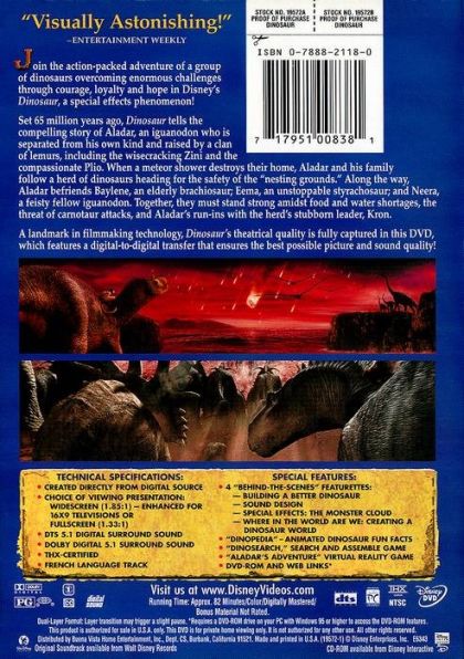 The shame about Disney’s live action/animated spectacle, Dinosaur, is that the level of creativity in the story in no way measures up to the technological accomplishments in creating the characters. Such as it is, the story tells the tale of a dinosaur egg that is carried far away from its mother and finally lands in a forest with a family of funky-looking lemurs. They raise the little dinosaur, called Aladar, as their own, and all is well until a meteor shower destroys the family’s home. The lemurs climb aboard Aladar and they take off for safer accommodations. Along the way, Aladar is faced, for the first time, with his own kind. One thing that should always be remembered: no matter how amazing or lovely a film is, it’s just simply got to tell a good story as well. There are two options for purchasing Dinosaur: a single disc with a nice selection of extras, or a double disc set that offers a second disc with tons and tons of extras that focus, of course, on the amazing and intricate art of digital animation. I had terrible troubles with the movie disc in this set. It seemed that there were times where I could not pause or fast forward. I tried other players, other remotes, fresh batteries, but to no avail. Is it just a disc glitch, or is Disney, once again, arrogantly controlling our fate? In this instance, I doubt that is the case. There are no forced ads on the films, by the way. (Laurie Sevano)